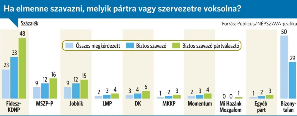 A Publicus mérése szerint az ellenzéki pártok kis mértékben növelték táborukat, míg a Fidesz népszerűsége valamelyest csökkent. Az összes megkérdezett körében a Fidesz-KDNP-t 48 százalék támogatja, az MSZP-Párbeszédet 16 százalék, míg a Jobbikot 15 százalék, a Demokratikus Koalíciót 6 százalék, az LMP-t pedig – a parlamenti küszöbhöz nem elegendő – 4 százalék. A Magyar Kétfarkú Kutyapárt tábora háromszázalékos, a Momentumot 4 százalék támogatja a biztos szavazó pártválasztók körében.