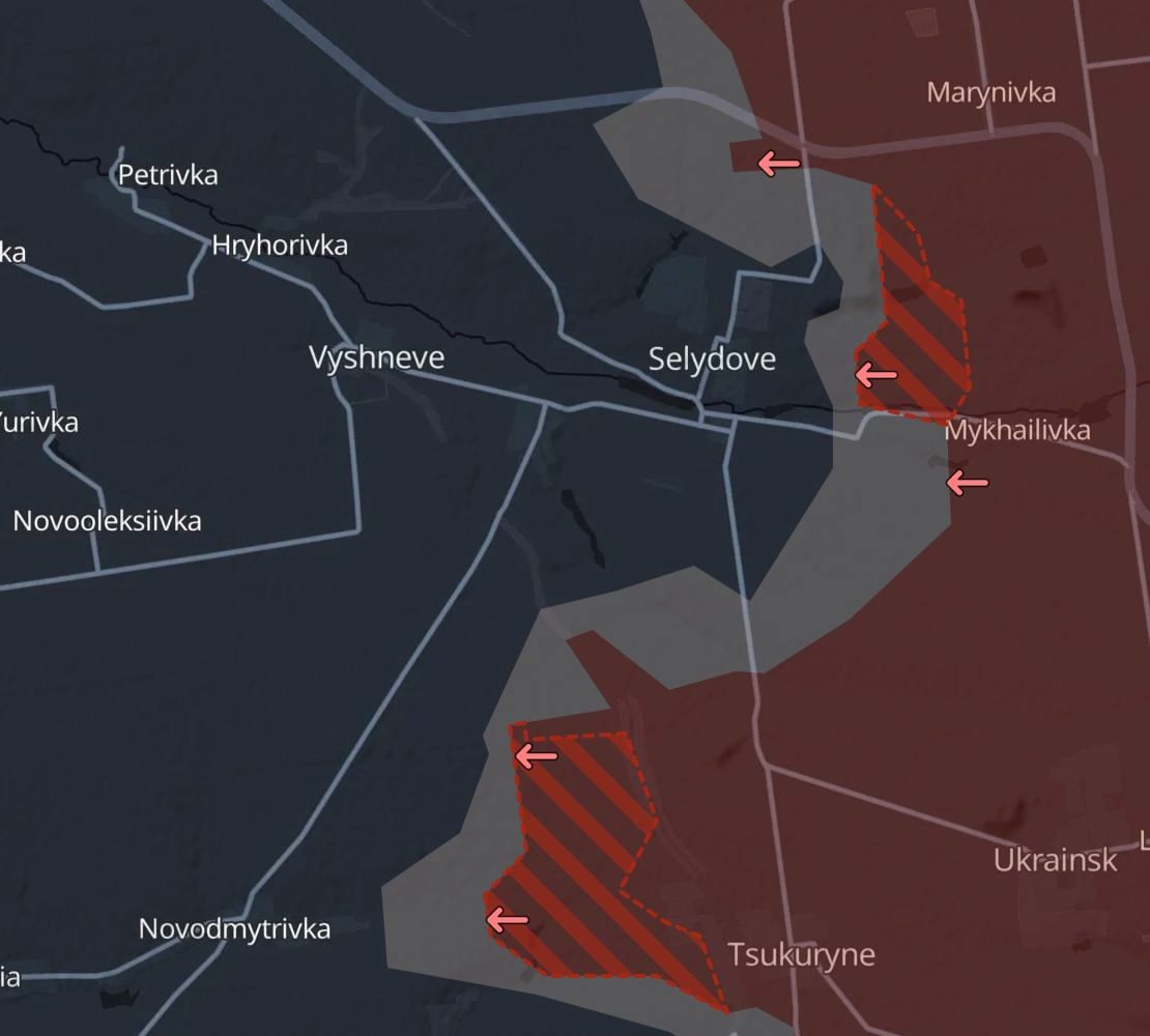 Ugyanakkor az ukrán hadsereg jelentése szerint az oroszok behatoltak Selidovo északi részére is. Ahogy a „Muchnoi” hívójelű vadászgép írja, az ipari övezetben erről az oldalról folynak a csaták. Dél felől információi szerint már Novovodmitrovka külterületén dúlnak a harcok.