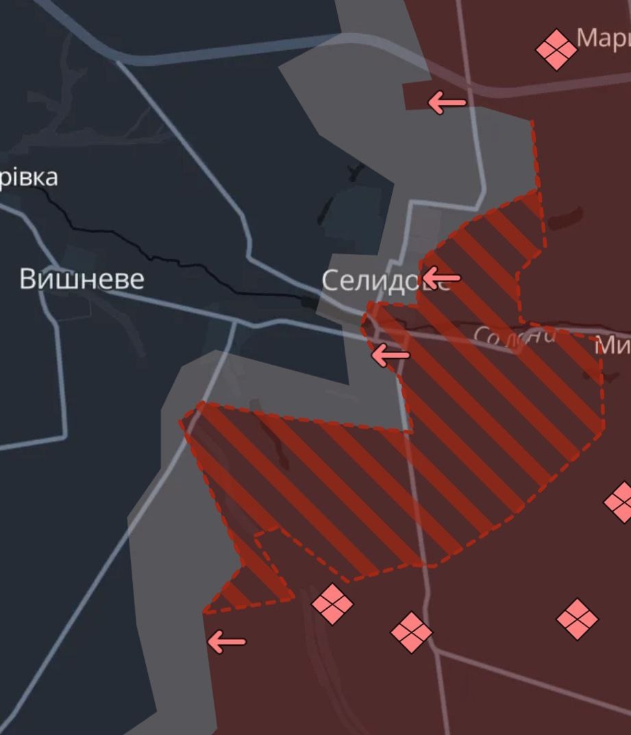 A katonaság korábban azt is közölte, hogy az oroszok már elérték Visnevoja környékét, Selidovtól nyugatra, ami még nem szerepel a Deep State térképén. Fennáll annak a veszélye, hogy egy ilyen támadás bekeríti a várost, mert Visnevoj felől már látható a Szelidovo-Pokrovszk autópálya, amelyen az ukrán fegyveres erők helyőrsége is ellátva van.