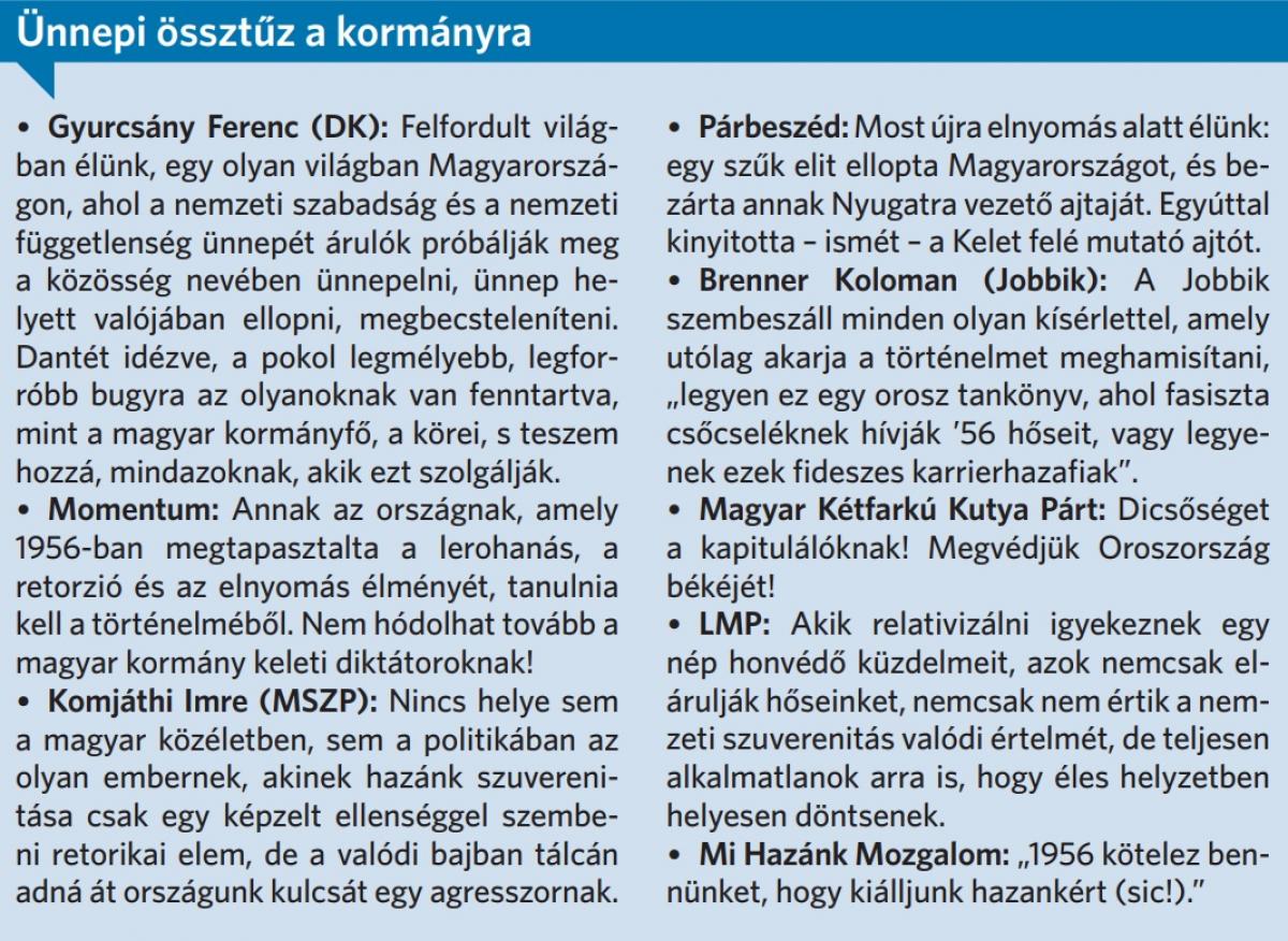 Hosszú évekbe telt, mire sikerült, de Orbán Viktor mostanra megtalálta szellemi alapjait. Komoly kihívás volt, hogyan mossa egybe 1956-ot, az orosz-ukrán háborút és a saját politikáját, de végre összerakta, igaz, racionalitás nincs az agymenésében – értékelte a miniszterelnök ünnepi beszédét Szentpéteri Nagy Richard politikai elemző. – Klasszikus, hogy ha egy politikus valamely ünnepen megnyilvánul, akkor megpróbálja azt összekapcsolni a saját politikájával, de általában azért akad valami vezérfonal, nem pedig egy torzításokkal, ferdítésekkel teli ideológiai katyvasz születik.