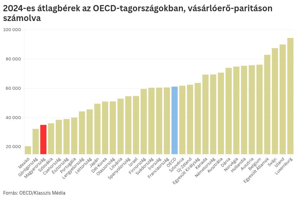 Ez elsőre ugyan jól hangzik, de akkor már kevésbé, ha megnézzük a Gazdasági Együttműködési és Fejlesztési Szervezet (OECD) vásárlóerő-paritáson (PPP) számolt statisztikáját, amely tagországonként mutatja meg az átlagbérek reálértékét, dollárba átszámolva.