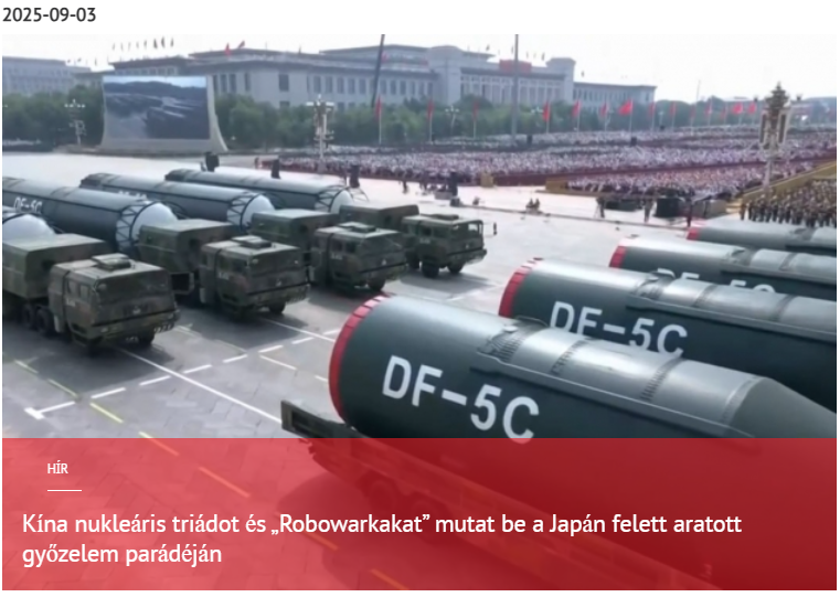 2025. szeptember 3-án nagyszabású katonai parádét tartottak a pekingi Tienanmen téren a militarista Japán felett aratott második világháborús győzelem 80. évfordulója alkalmából. Kína bemutatta nukleáris triádját és a legújabb katonai felszerelését, köztük a Dongfeng-5C ultranagy hatótávolságú interkontinentális ballisztikus rakétát (ICBM), amelynek hatótávolsága akár 20 000 kilométer is lehet, és amely képes a világ bármely pontján célpontot eltalálni – jelenti a Xinhua.