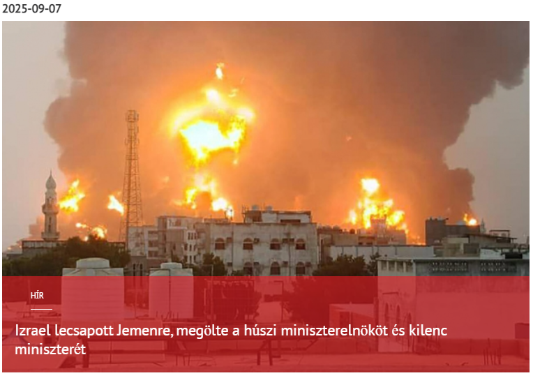 Az izraeli légierő sikeres hadműveletet hajtott végre Jemenben, megölve a húszi miniszterelnököt és legalább kilenc miniszterét – jelentette az izraeli 12-es csatorna 2025. szeptember 7-én. Az újságíróknak sikerült megtudniuk, hogy a tervezett bombázás előtt néhány perccel a pilóták parancsot kaptak a támadás leállítására és a tűznyitás mellőzésére. A repülőgépek körülbelül másfél órán át köröztek Jemen felett, arra várva, hogy hírszerzés megerősítse a húszi vezetők jelenlétét a létesítményben.