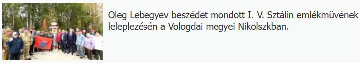 Oleg Lebegyev, a Vologdai régió kommunista pártjának képviselője beszédet mondott I. V. Sztálin emlékművének leleplezésén a Vologdai régióbeli Nikolszkban. A Győzelem Generalisszimuszának mellszobrát az Oroszországi Föderáció Kommunista Pártja Vologdai Regionális Szervezetének tagjai, a párt támogatói és a helyi hazafias szervezetek kezdeményezésére és finanszírozásával állították fel a Vologdai régióbeli Nikolszkban.