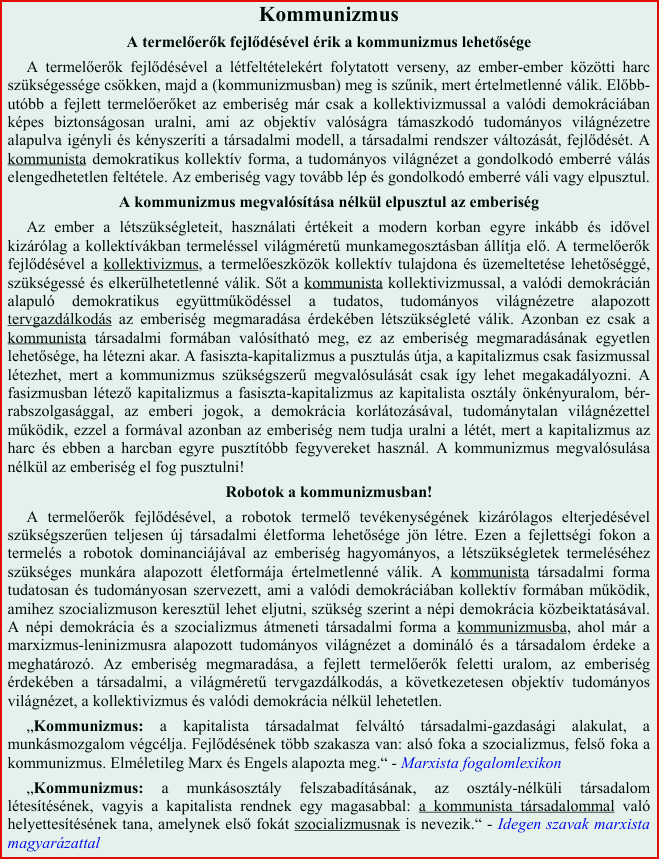 A kommunizmus tudományos világnézettel működő demokratikus kollektív társadalmi forma!
