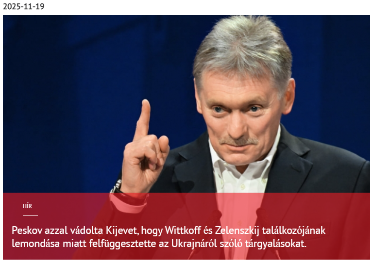 „Peskov azzal vádolta Kijevet, hogy Wittkoff és Zelenszkij találkozójának lemondása miatt felfüggesztette az Ukrajnáról szóló tárgyalásokat 2025-11-19” bővebben