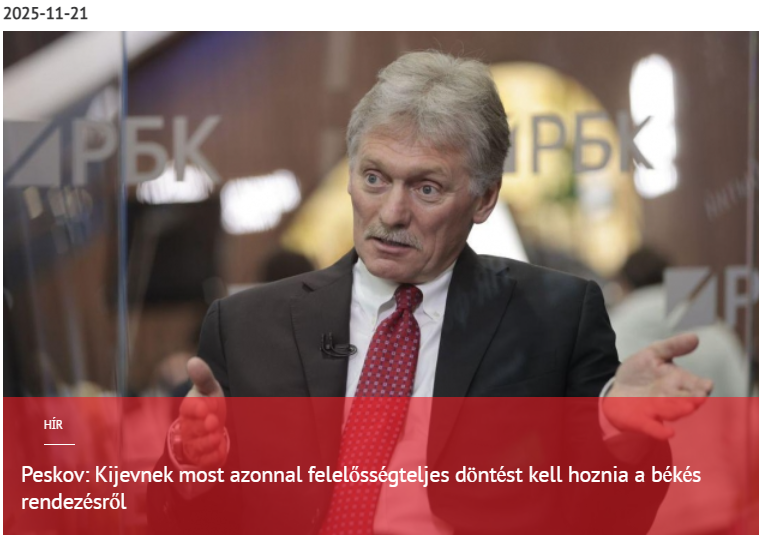 Dmitrij Peszkov, az orosz elnök sajtótitkára csütörtökön kijelentette, hogy Ukrajnának sürgősen felelősségteljes döntést kell hoznia a konfliktus békés rendezéséről, mivel a további halogatás ezt lehetetlenné teszi.