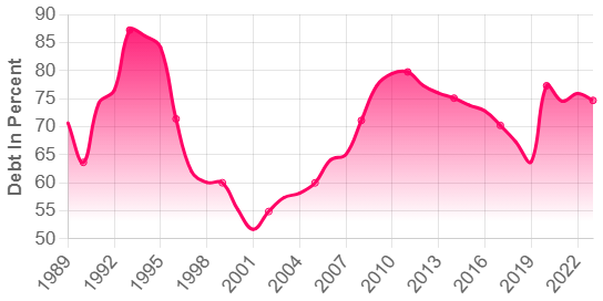 Japán: kb. 235% (tartós költségvetési hiányok és elöregedő népesség miatt)