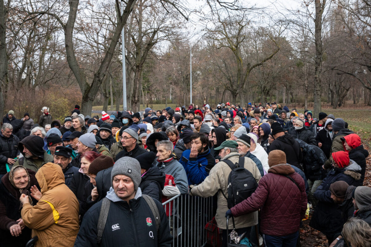 Egy hideg decemberi napon Budapest lakosai állnak sorban egy jótékonysági szervezet által szétosztott élelmiszerért. Ezek a sorok a stagnáló magyar gazdaság barométerei, és egyben holtteher Orbán Viktor elnök számára a tavaszi választások előtt. (Forrás: reuters.com)