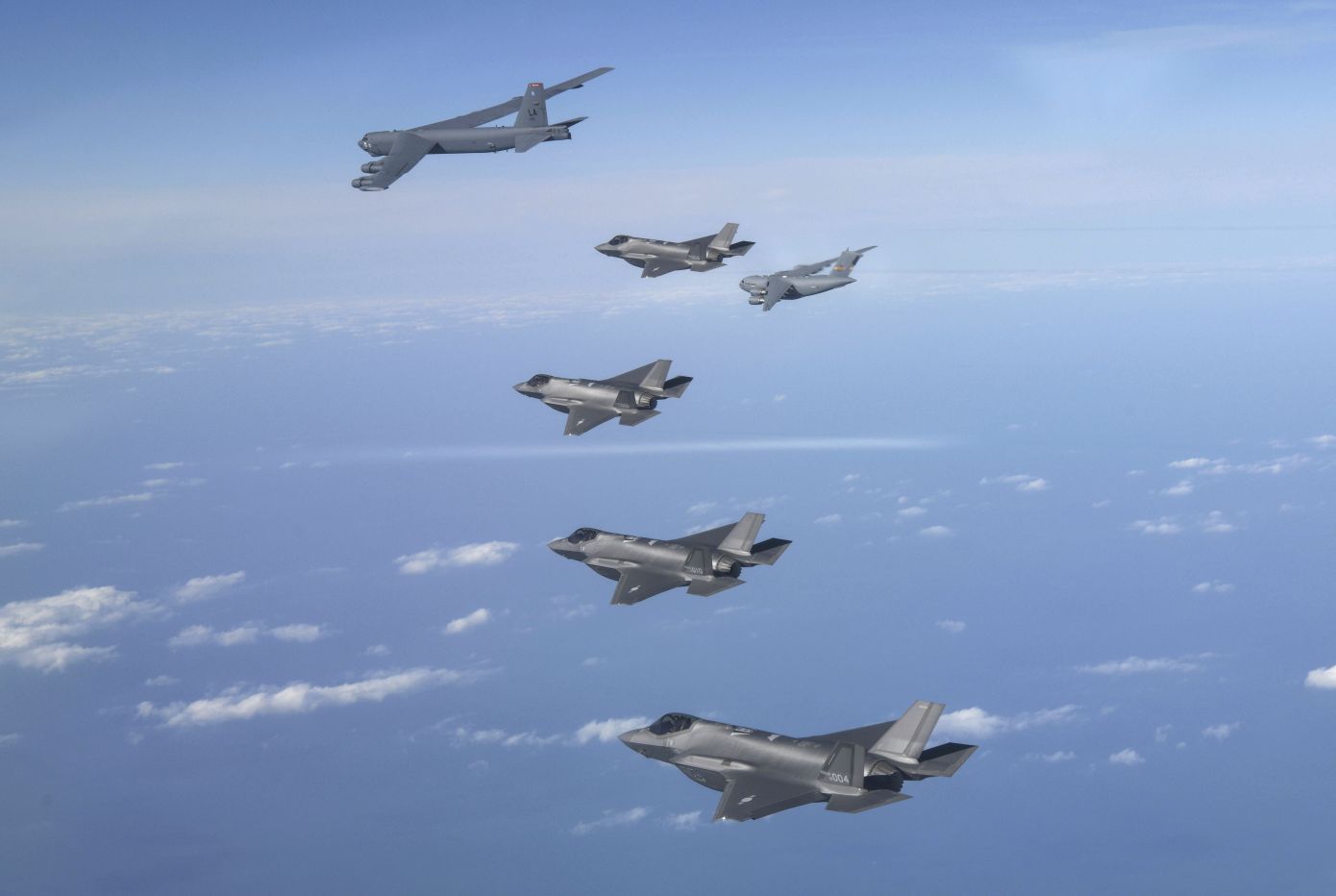 In this photo provided by South Korean Defense Ministry, A U.S. B-52 bomber, C-17 and South Korean Air Force F-35 fighter jets fly over the Korean Peninsula during a joint air drill in South Korea, Tuesday, Dec. 20, 2022. The United States flew nuclear-capable bombers and advanced stealth jets in a show of force against North Korea on Tuesday, as the powerful sister of North Korean leader Kim Jong Un derided doubts about her country’s military and threatened a full-range intercontinental ballistic missile test. (South Korean Defense Ministry via AP)