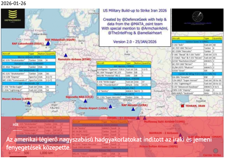 Az Egyesült Államok demonstratív katonai felhalmozódás szakaszába lép a Közel-Keleten, bejelentette a többnapos légierő-gyakorlatok megkezdését a gyors telepítés és a rugalmas reagálás gyakorlására. Az Egyesült Államok Központi Parancsnokságának (CENTCOM) hivatalos közleménye szerint ezeknek a manővereknek a célja az amerikai egységek ellenálló képességének és harckészségének tesztelése a regionális feszültségek hirtelen eszkalációjával szemben. Jelenleg egy jelentős erőcsoport már Irán körül összpontosul, beleértve modern vadászgépeket, stratégiai tartálykocsi repülőgépeket, AWACS fedélzeti korai riasztórendszereket és több anyahajó-csapásmérő csoportot. A szakértők ezeket a műveleteket nem rutinszerű kiképzésnek, hanem egy esetleges katonai művelet végső előkészületeinek tekintik a régióban.