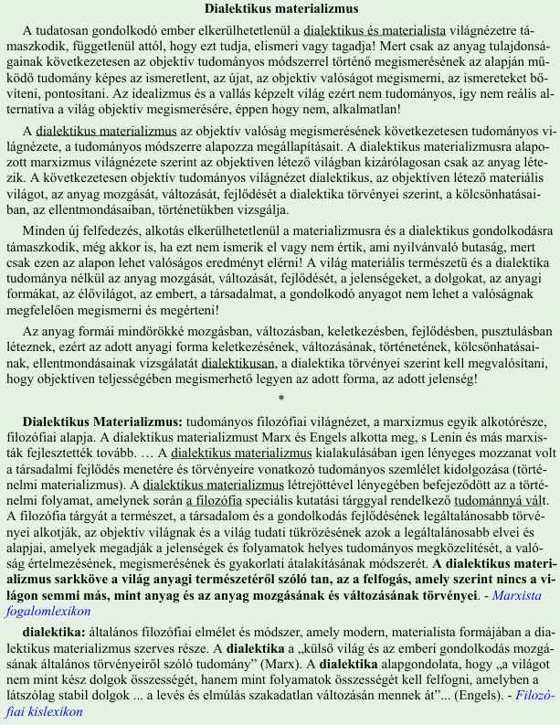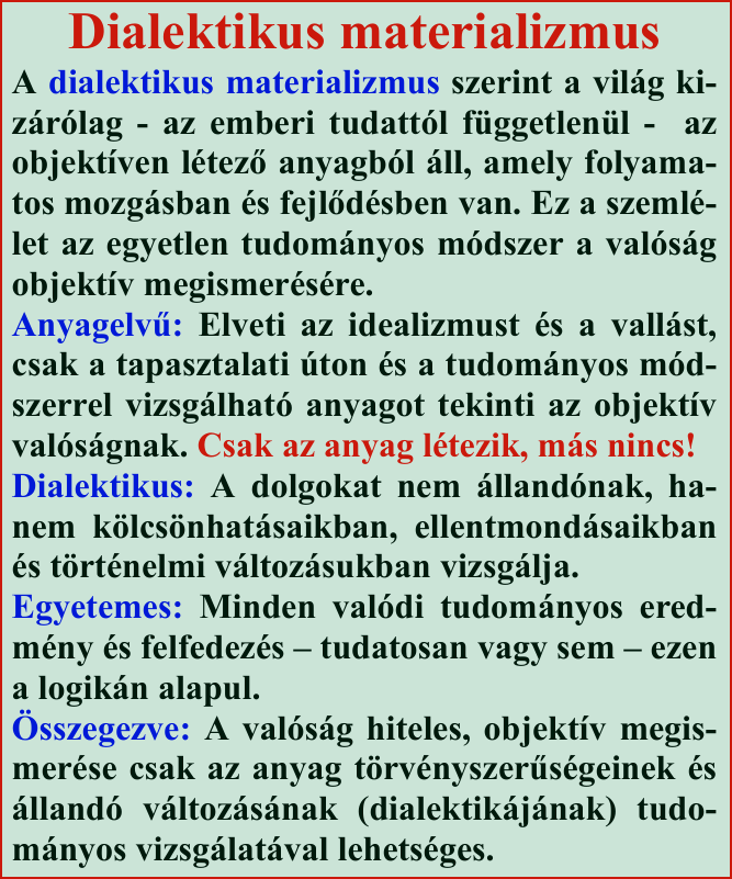 Dialektikus Materializmus: tudományos filozófiai világnézet, a marxizmus egyik alkotórésze, filozófiai alapja.