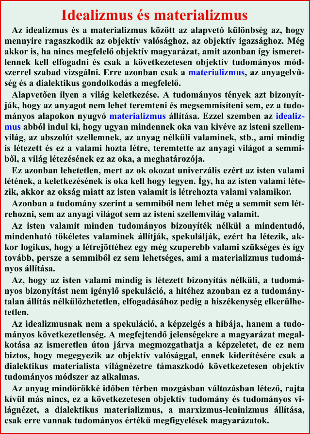 Az idealizmus és a materializmus között az alapvető különbség az, hogy mennyire ragaszkodik az objektív valósághoz, az objektív igazsághoz.