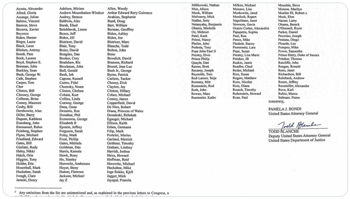 A Kongresszusnak február 14-én küldött hivatalos levél szerint az Igazságügyi Minisztérium több millió e-mailt, fényképet és dokumentumot, valamint egy 305, a dossziékban megnevezett magas rangú személy végleges listáját hozta nyilvánosságra.