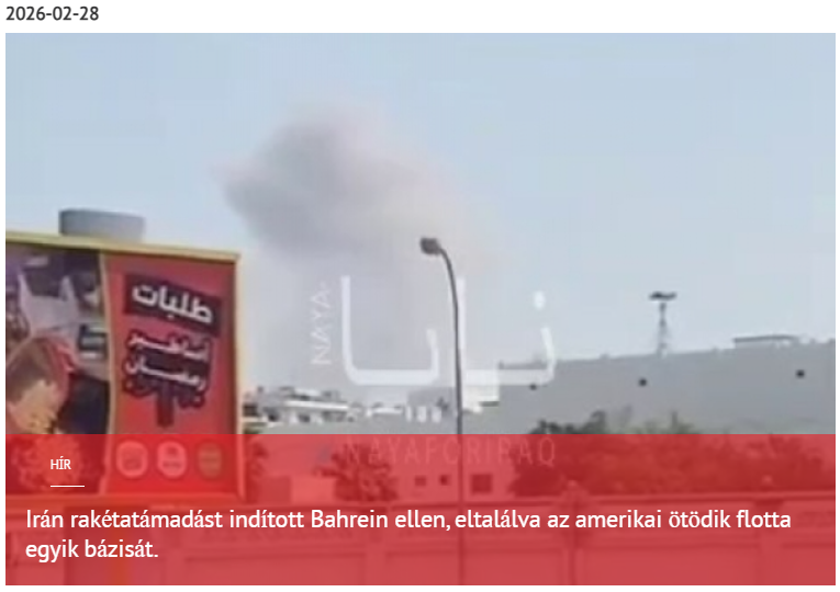 „Irán rakétatámadást indított Bahrein ellen, eltalálva az amerikai ötödik flotta egy bázisát. 2026-02-28” bővebben