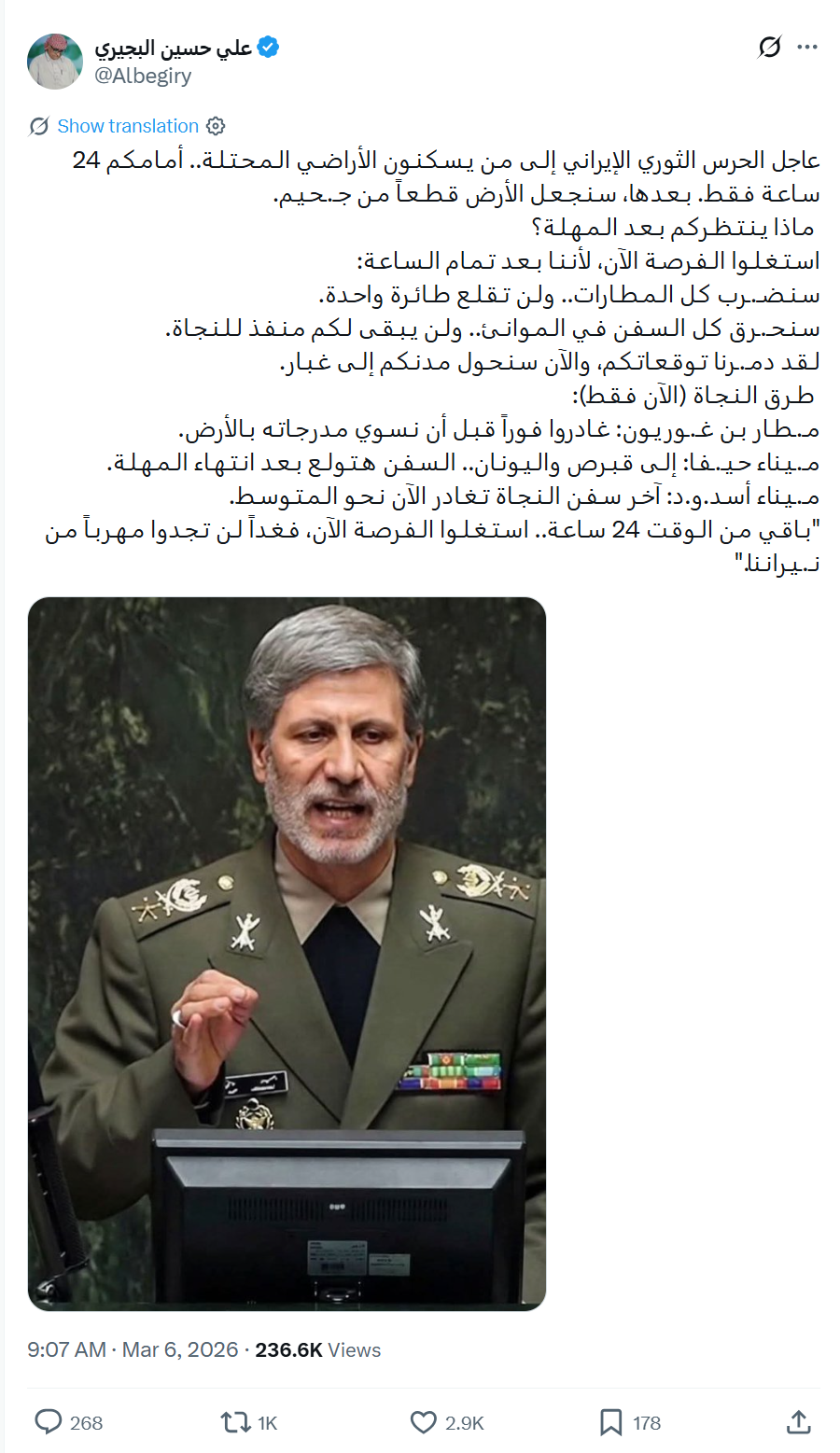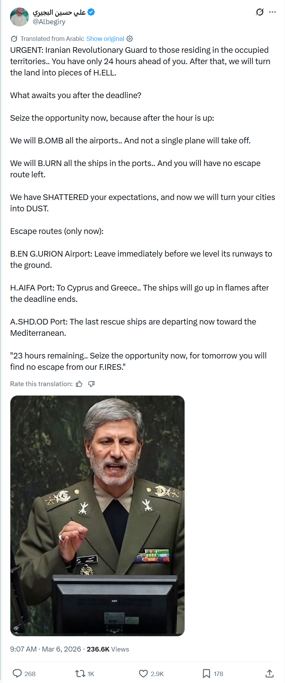 Az Iráni Forradalmi Gárda (IRGC) üzenete, amely szerint ma reggel 9 órakor (amerikai keleti idő szerint) az izraelieknek 24 órájuk van elhagyni Izraelt, mielőtt az egész országot elpusztítják.