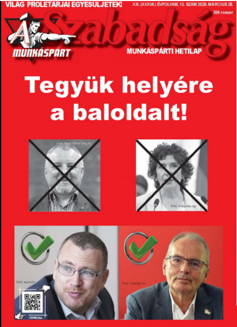 Szóval, két szereplővel valószínűleg nem fogunk találkozni az április 12-e utáni magyar politikában. Talán végre helyére kerül a baloldaliság eszméje is. Talán sokévtizedes liberális-szocialista ámokfutás után megértik az emberek, hogy nem az a baloldali, aki a dolgozók előtt hangosan szidja a tőkéseket, majd stikában kiegyezik velük. Attól sem lesz senki baloldali, hogy naponta kétszer elénekli az EU himnuszát és igyekszik elhitetni velünk, hogy „testvér lészen minden ember.” A tőkés és a munkás sohasem lesz egymás testvére. A baloldali a dolgozó ember, a nép javát akarja, nem a tőkések profi tját növelni. A baloldali realista: küzd azért, hogy a dolgozónak már ma jobb legyen, de tudja és hirdeti, hogy gyökeres változást csak az hoz, ha a pénz uralmát felváltja az emberek érdekeire épülő kormányzás. A baloldali a nemzet, a függetlenség mellett van, olyan világrendet akar, amely az egyenlőségre, a kölcsönösen előnyös együttműködésre épül. A baloldali a béke mellett van, és éppen ezért küzd a kapitalizmus, a tőke háborúra ösztönző kapzsisága ellen. A 2026. évi választáson egy ilyen párt indul, A Szolidaritás-Munkáspárt koalíciója. A mi jelöltjeink nem lépnek vissza. Nem egyezkedünk egyik tőkés párttal sem. Nem Fideszre vagy Tiszára szavazunk, hanem a békére, a normalitásra, a biztonságos jövőre. Mi baloldali párt vagyunk.
