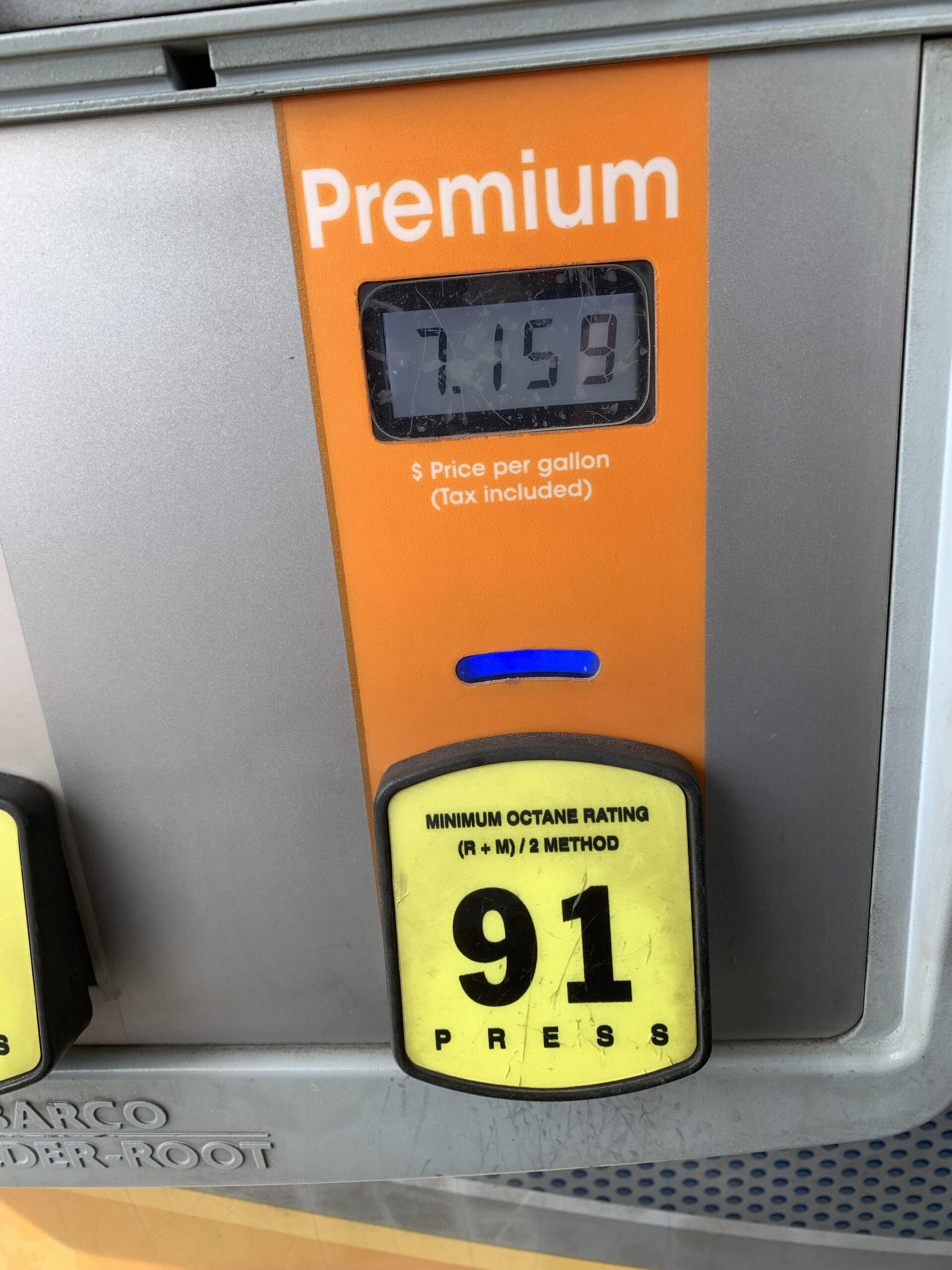 Ennek a weboldalnak egy olvasója Los Angelesből, Kaliforniából küldte nekem a fenti fotót, amelyen 20,9 gallon 91-es oktánszámú benzint vett, és 150 dollárjába került. Ez 7,15 dollár gallononként!