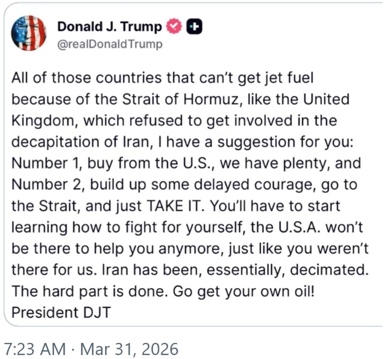 „Mindazon országoknak, amelyek a Hormuzi-szoros miatt nem jutnak repülőgép-üzemanyaghoz, mint például az Egyesült Királyság, amely nem volt hajlandó részt venni Irán lefejezésében, van egy javaslatom a következőkre: 1. Vásároljatok az USA-tól, van nekünk bőven, 2. Vásároljatok bátorságot, menjetek a szoroshoz, és VEGYÉTEK EL.”