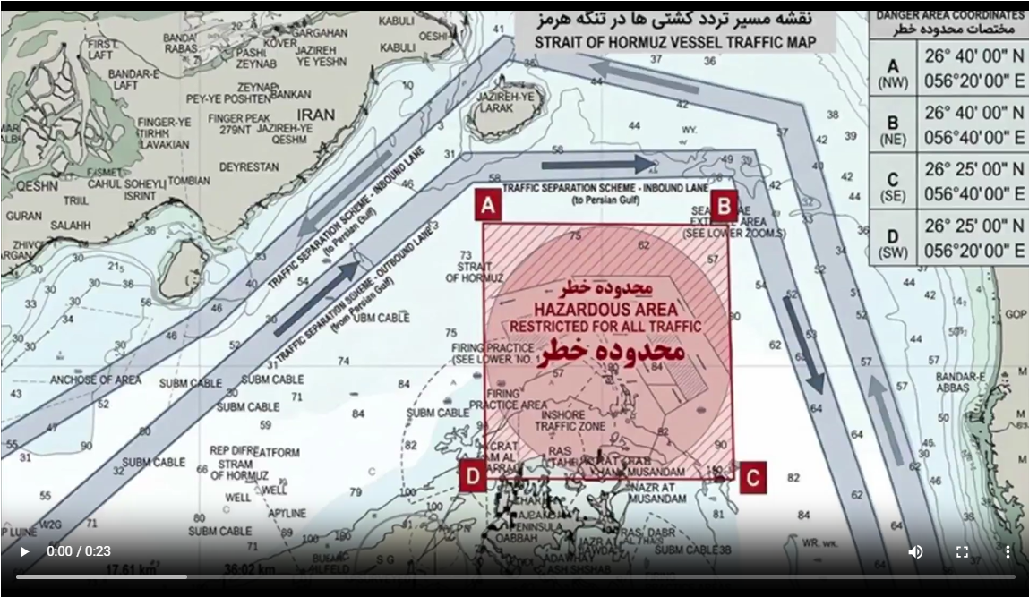 A Hormuzi-szoros veszélyes területnek van nyilvánítva, minden forgalom korlátozott. A térkép iráni. A szabályok irániak, és a következmények is irániak.