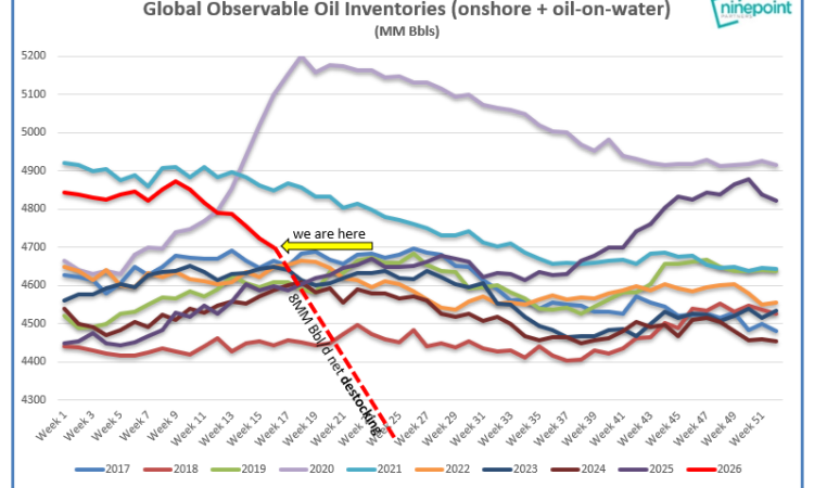 Az alábbi, a NinePoint Partners által a Kpler segítségével készített diagram a bolygó összes föld feletti és óceánon található olajtároló tartályát mutatja.