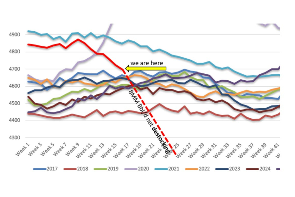 Az alábbi diagram a világszerte tárolt olajkészleteket és a hajókon már meglévő egyéb olajkészleteket mutatja. Az előre beállított, a napi igények kielégítésére szolgáló olajkészlet-csökkentéssel, más néven készletcsökkentéssel a diagram azt mutatja, hogy az összes tartalék olaj az idei év június 15-ére – az év 26. hetére – körülbelül elfogy. A PIROS VONAL azt mutatja, hogyan fognak alakulni a dolgok: