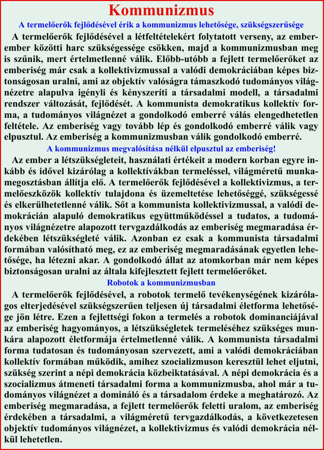 A kommunizmus tudományos világnézettel működő demokratikus kollektív társadalmi forma!