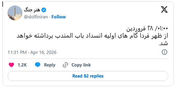 „A húszik holnap, délben blokád alá helyezik a Bab al-Mandab-szorost Jemenben helyi idő szerint. 2026. április 16.” bővebben