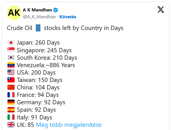 A világszerte tárolt olaj fennmaradó napjai 2026. április 17. Facebook Twitter LinkedIn Messenger Email Hal Turner Radio Show.com Az alábbiakban a megmaradt nyersolajkészletek listája látható országonként: Legfrissebb hírek A világszerte tárolt olaj fennmaradó napjai A húszik holnap, délben blokád alá helyezik a Bab al-Mandab-szorost Jemenben helyi idő szerint. Legutóbbi étkezés: USS Abraham Lincoln repülőgép-hordozó FLASH: Oroszország azt állítja, hogy Finnországból és a balti államokból érkező drónok támadták meg; az ENSZ Alapokmányának 51. cikkére – önvédelem – hivatkozhat Rendkívül érzékeny titkos információ: USA – háború FRISSÍTVE 11:09 EDT — MEGERŐSÍTVE: *** SaLa – Világhíradó – SaLa világnézete – Harc a gondolkodó emberré válásért! Facebook Twitter LinkedIn Messenger Email