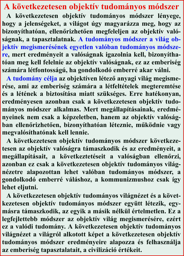 A következetesen objektív tudományos módszer lényege, hogy a jelenségeket, a világot úgy magyarázza meg, hogy az bizonyíthatóan, ellenőrizhetően megfeleljen az objektív valóságnak, a tapasztalatnak.