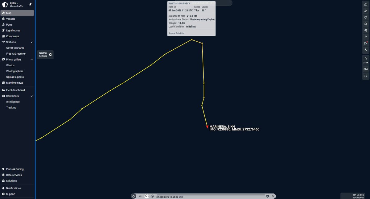 A MarineTraffic adatai szerint a Marinera északkelet felé halad az Atlanti-óceánon Izland és az Egyesült Királyság között. Innen az útvonal vagy a Balti-tengerre vezethet, vagy megkerülve Skandináviát elérheti Murmanszkot, Oroszország jégmentes sarkvidéki kikötőjét.