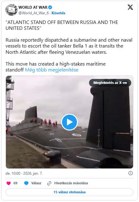 Oroszország egy tengeralattjárót és több haditengerészeti hajót küldött az Atlanti-óceánra, hogy elfogjon egy olajszállító tartályhajót, amelyet az Egyesült Államok próbált meg elfogni a Venezuelára nehezedő nyomásgyakorlás részeként – írja a The Wall Street Journal.
