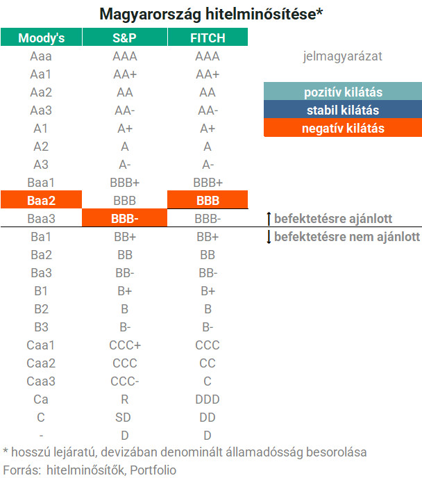 A Fitch Ratings 2024 végén meglepetésre stabilra javította a Baa2-nek megfelelő BBB osztályzat kilátását, majd egy évre rá újra negatív kilátást adott annak, így most ugyanott állunk náluk, mint a Moody’s-nál.